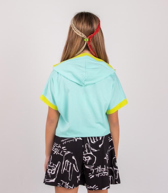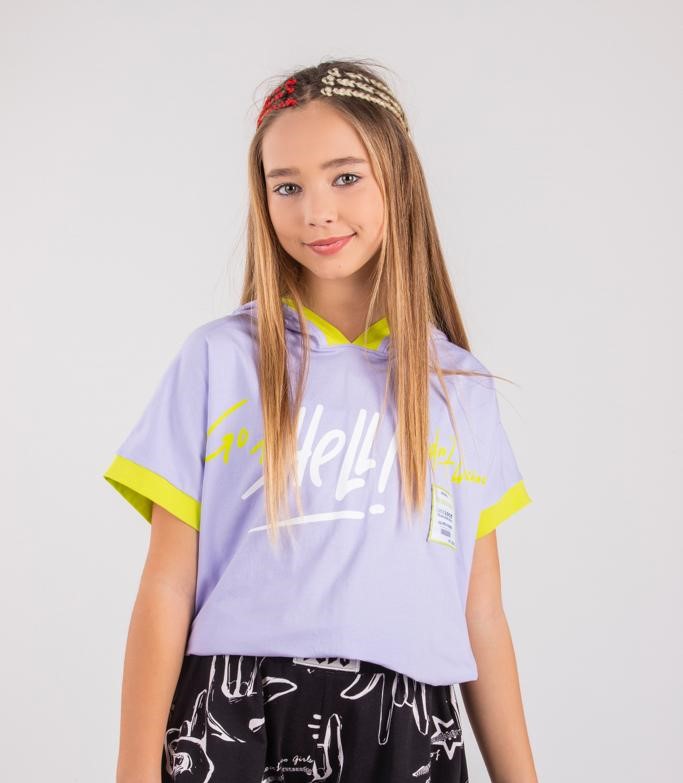 Яркая футболка с капюшоном, на кулиске отлично подходит для создания стильного образа.