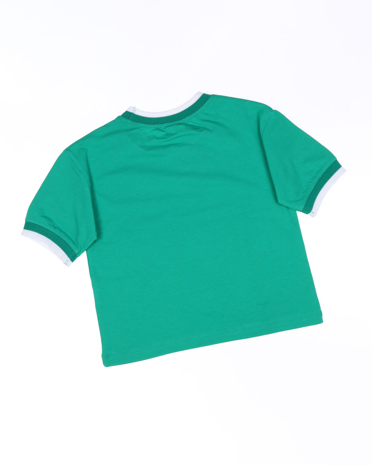 Футболка для девочки укороченная  оптом выполнена из плотного, мягкого трикотажа и украшена графичным принтом. Горловина круглой формы,  низ рукавов обработан трикотажными манжетами.