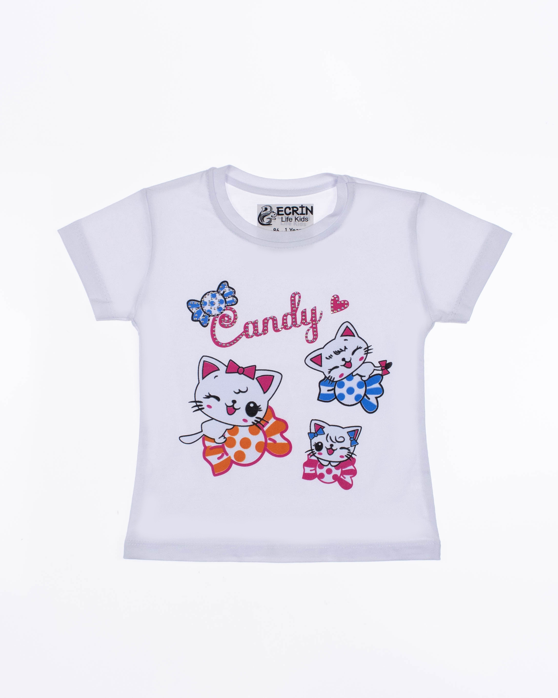 Футболка ECRIN для девочки оптом, производства Турция. Модель приталенного силуэта с короткими рукавами, милый принт украшен стразами.