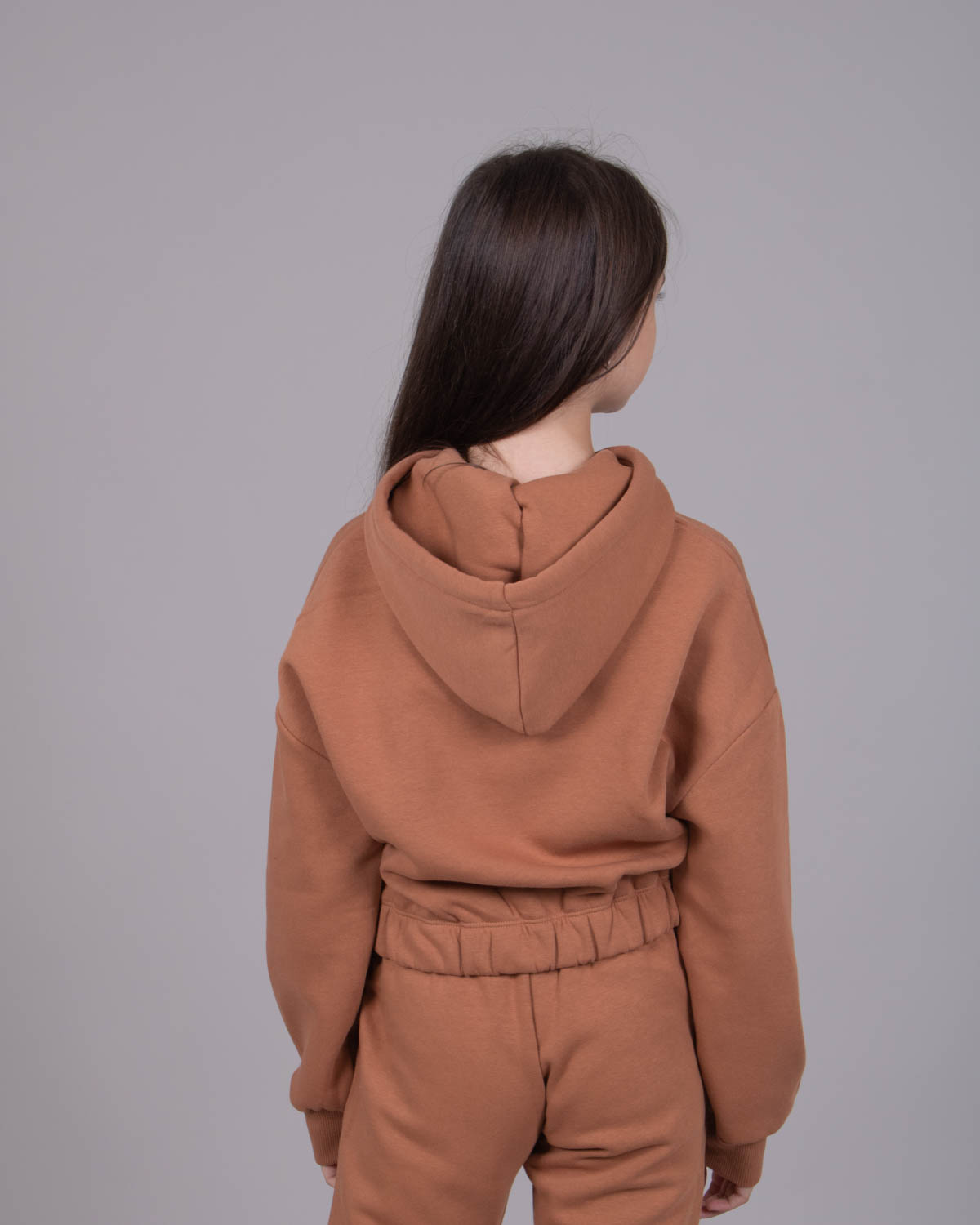 Утеплённый спортивный костюм для девочек в из плотного футера с начесом. Оптимальный объём худи не будет сковывать движений, легко сочетается с верхней одеждой. Худи укороченное на резинке, с объемным капюшоном. Утеплённые брюки на манжетах с боковыми карманами.