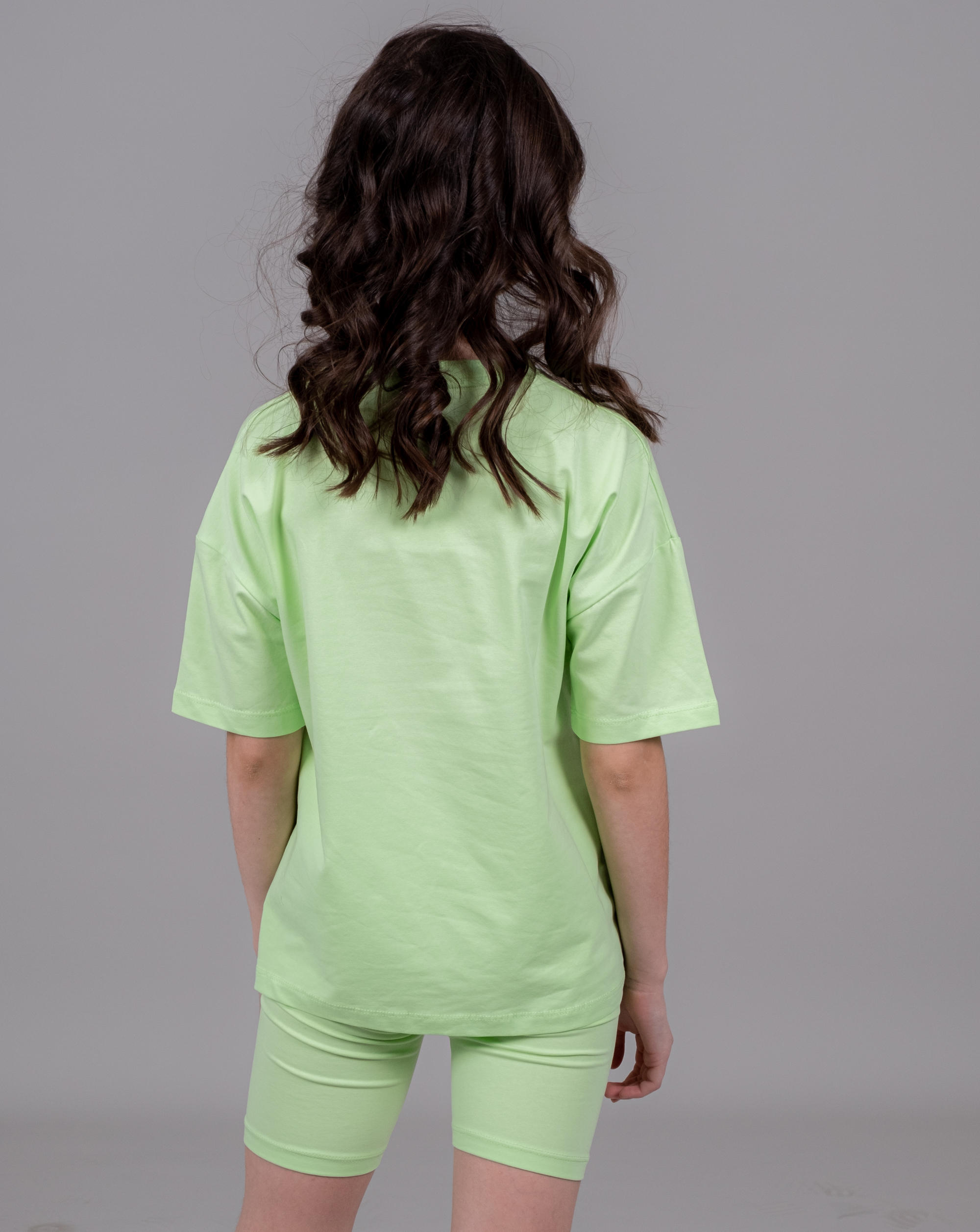 Летний костюм CEGISA для девочки из эластичного трикотажа кулирка. Футболка прямого кроя, со спущенной линией плеча и велосипедки.