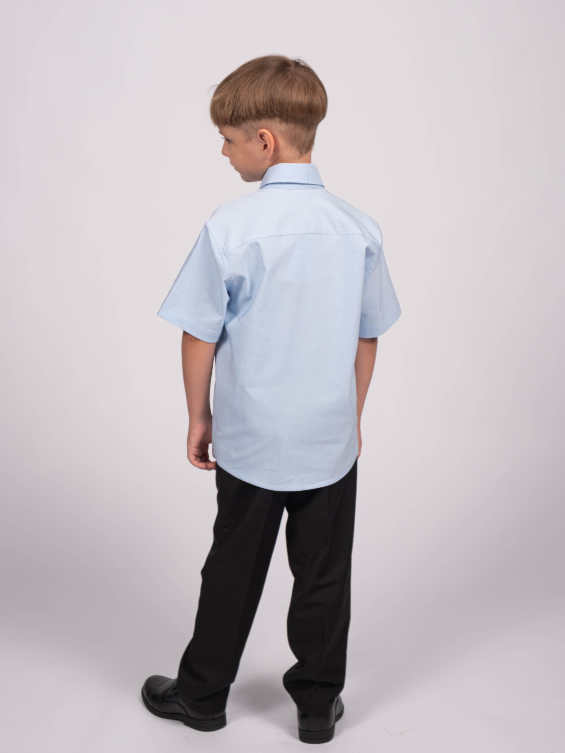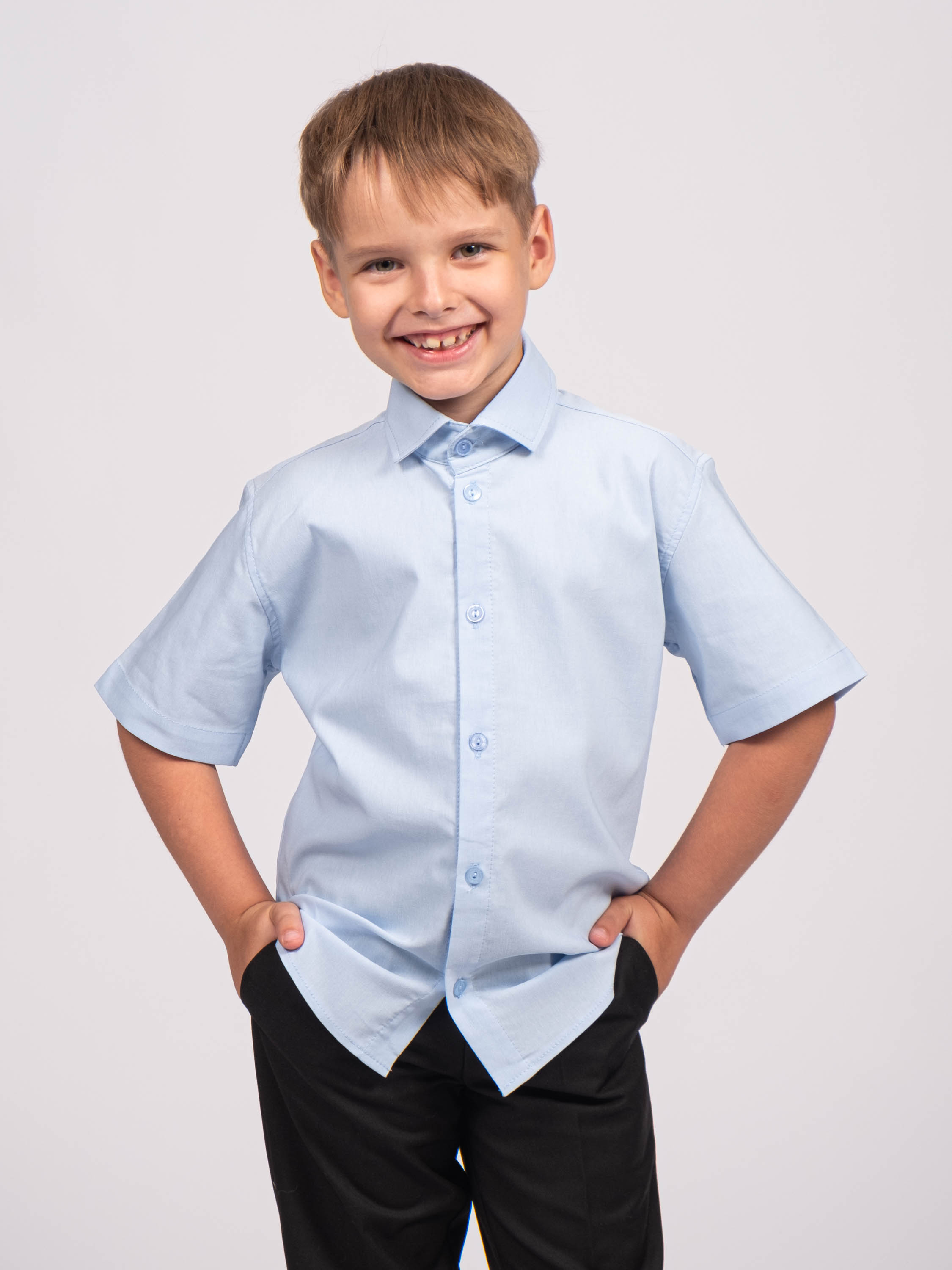 Детская однотонная рубашка для мальчиков оптом. Рубашка изготавлена из смесового материала высокого качества. Модель застегивается на пуговицы.