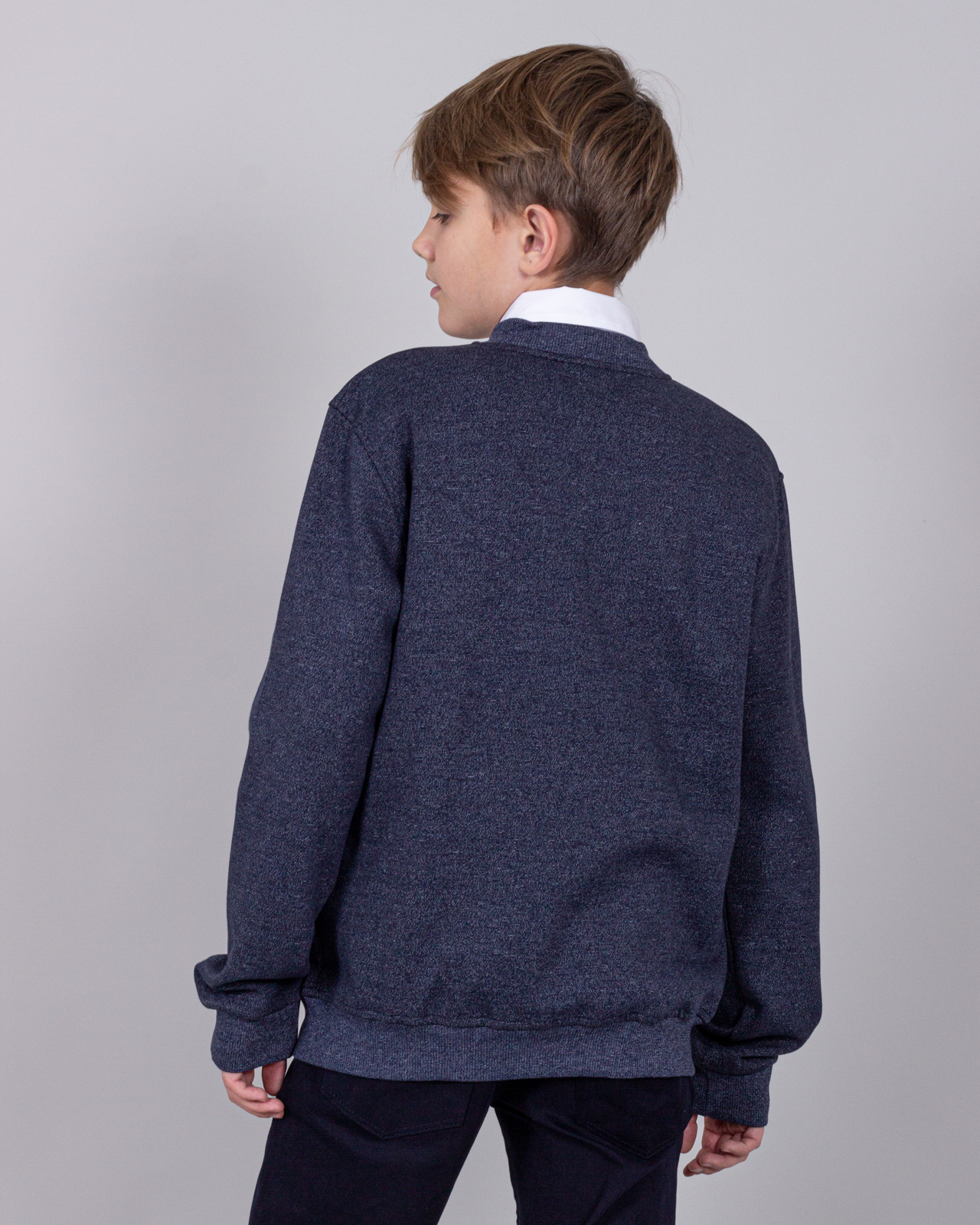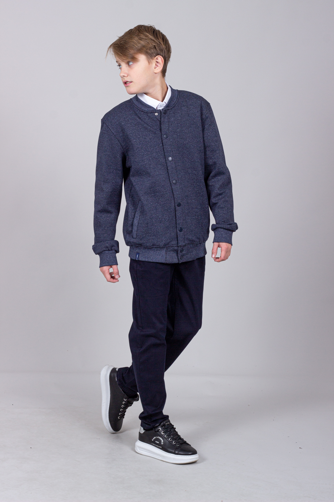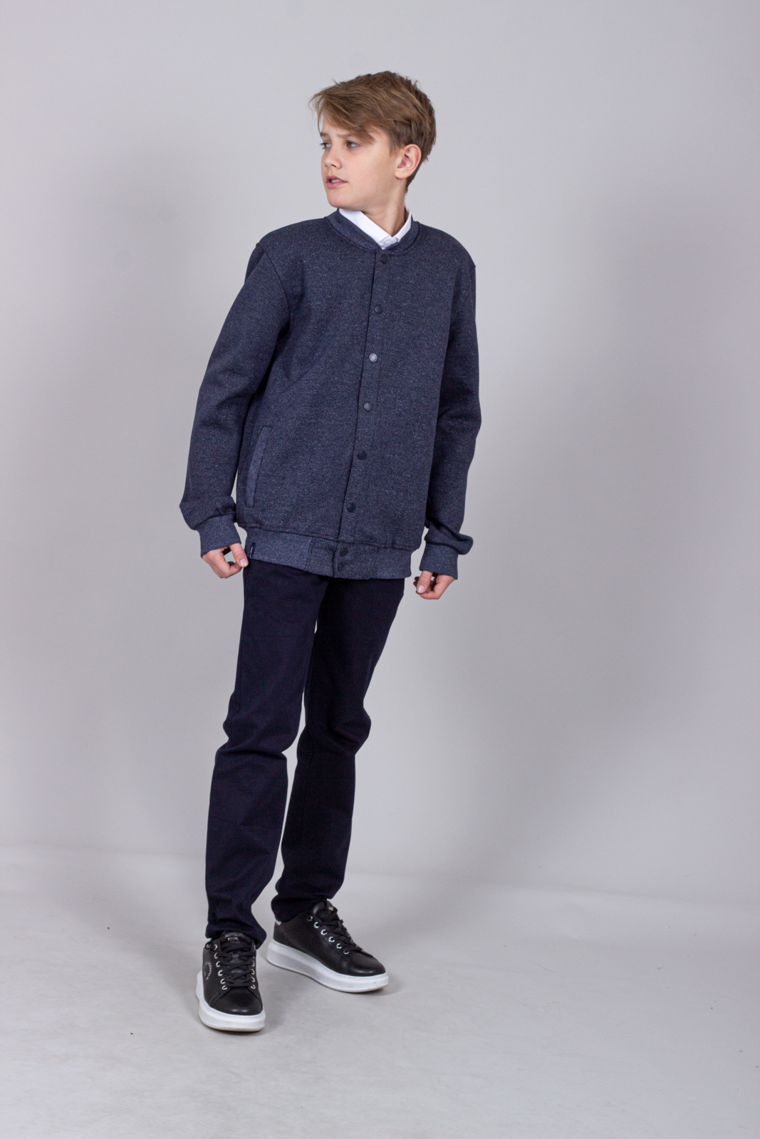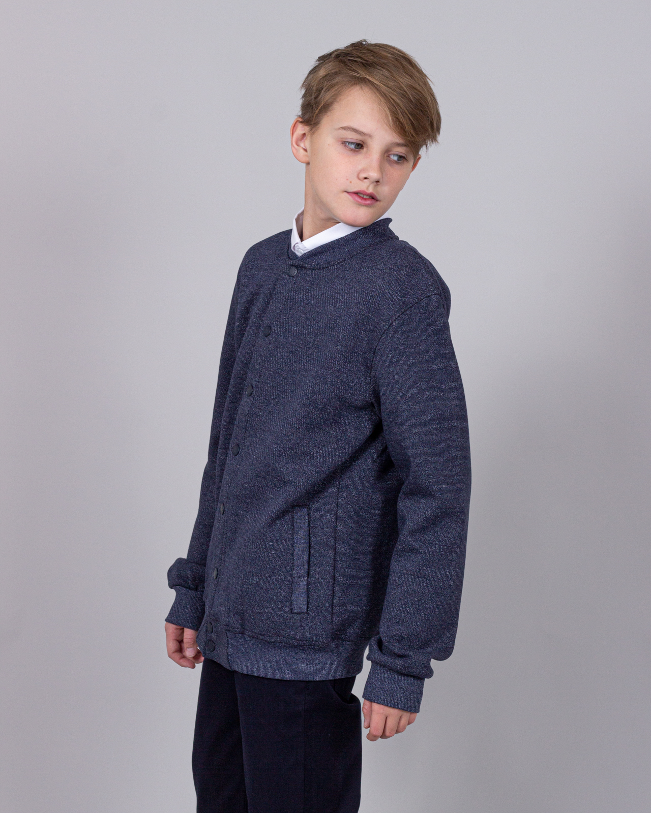 Трикотажный бомбер  для мальчика. Выполнен из смесовой ткани, в составе которой натуральный хлопок с  добавлением полиэстера. Воротник стойка. Низ изделия и рукава на трикотажном манжете. Вместительные карманы и разъемная застежка - кнопки. Хорошо сохраняет цвет и форму при длительной носке и после многократных стирок. Прекрасно будет смотреться как школьная форма.
