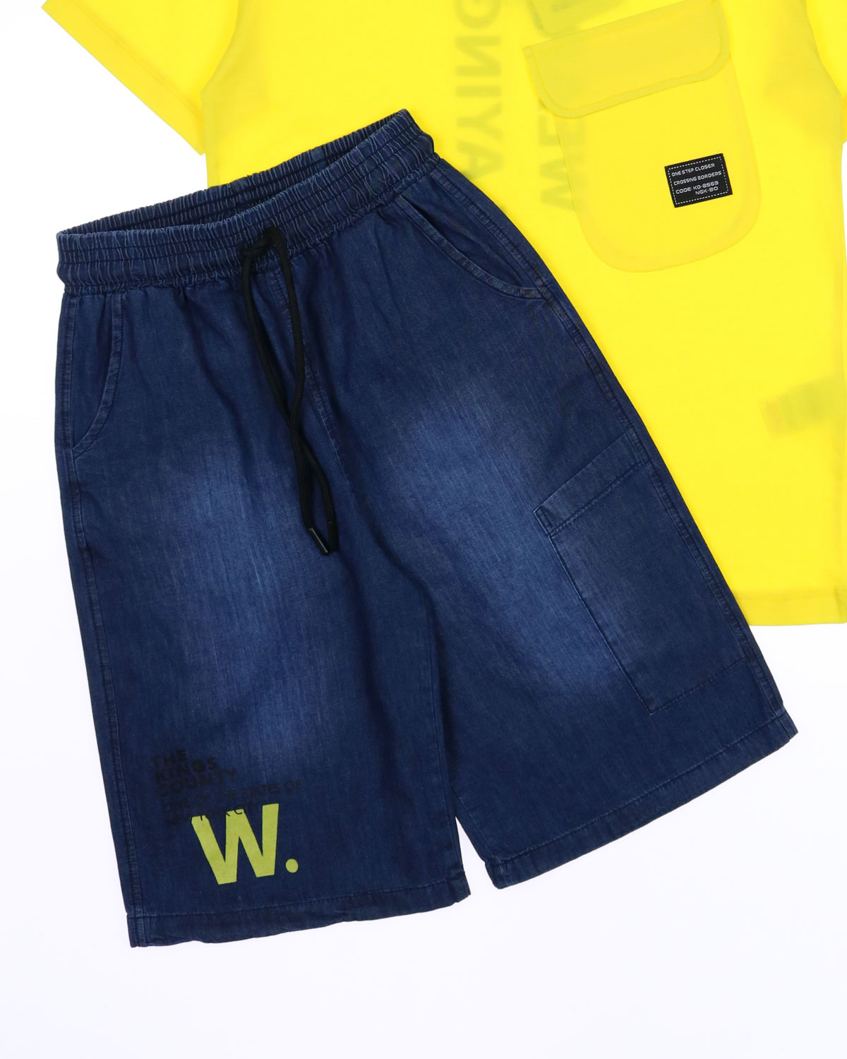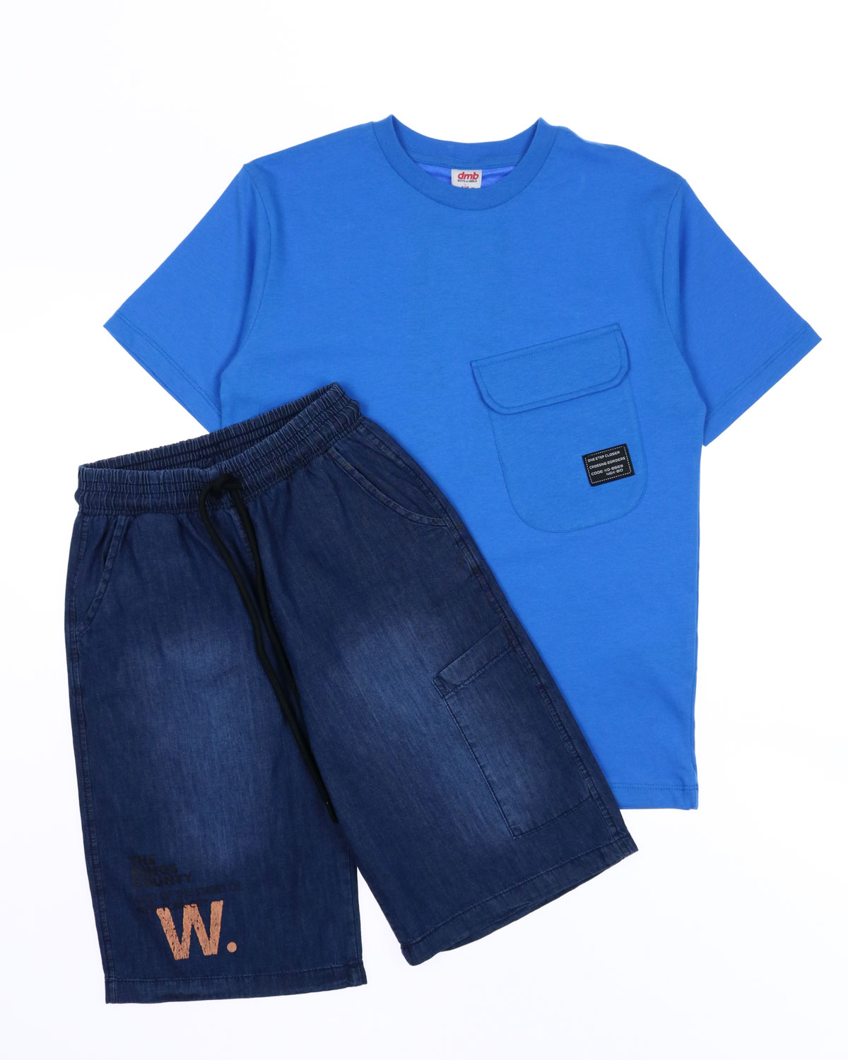 Костюм для мальчика DMB оптом. Футболка прямого кроя с короткими рукавами, на груди накладной карман. Бриджи из облегченной джинсы без эластана с боковыми  карманами. Пояс на резинке с функциональным шнурком позволяет ругулировать объем на талии.