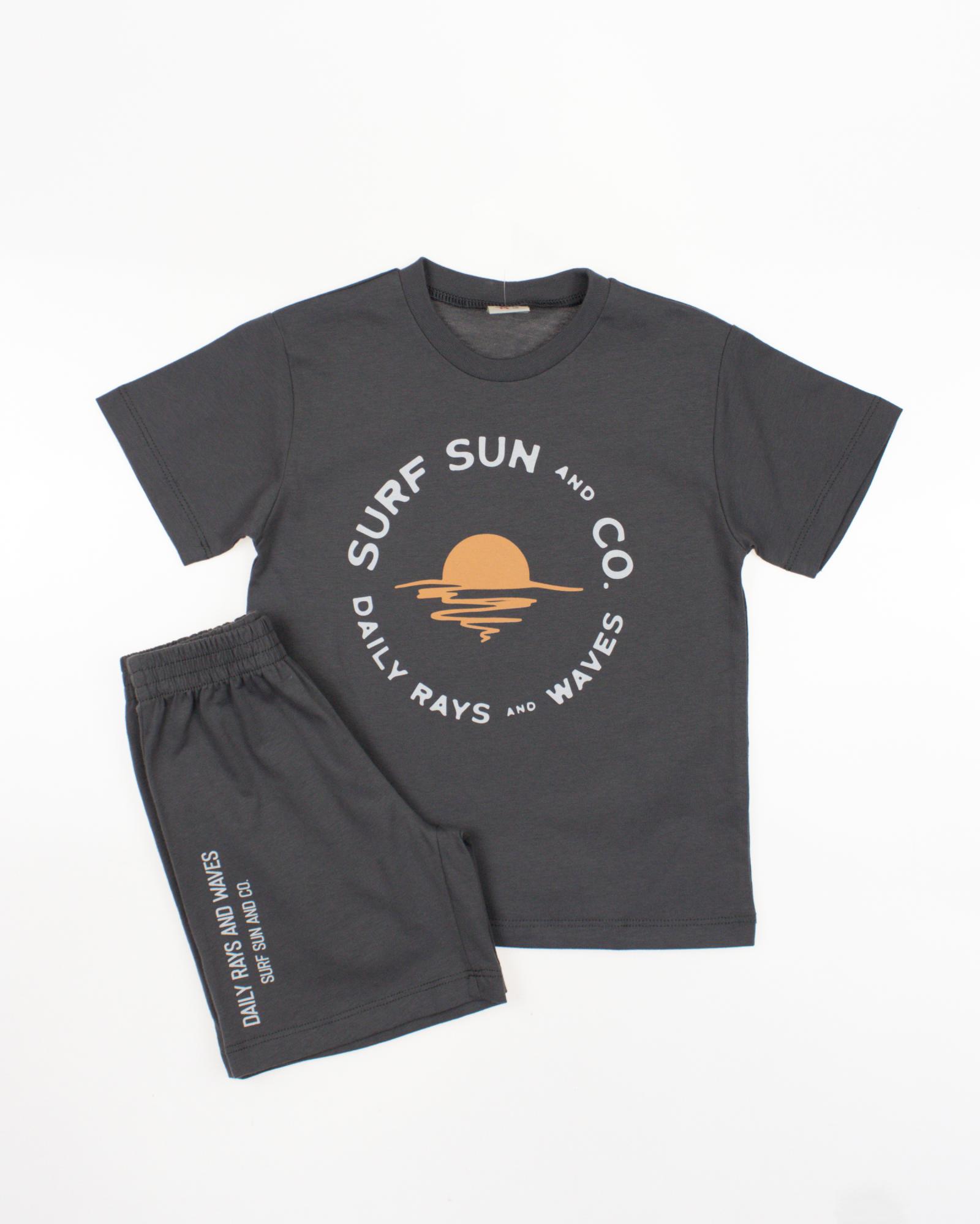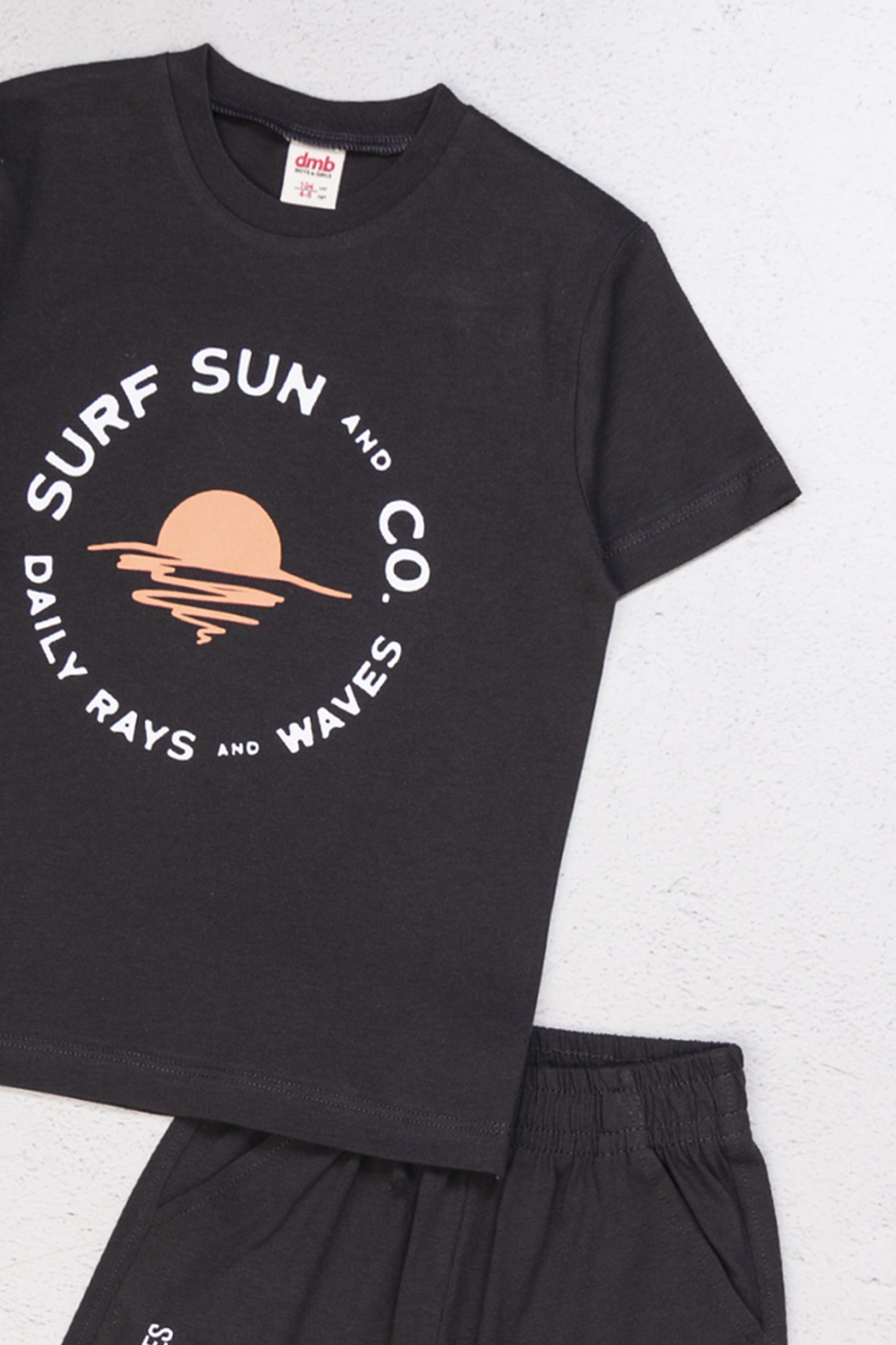 Детский трикотажный костюм DMB для мальчика оптом. Футболка прямого кроя с короткими рукавами, спереди расположен стильный принт. Шорты без карманов на эластичном поясе.