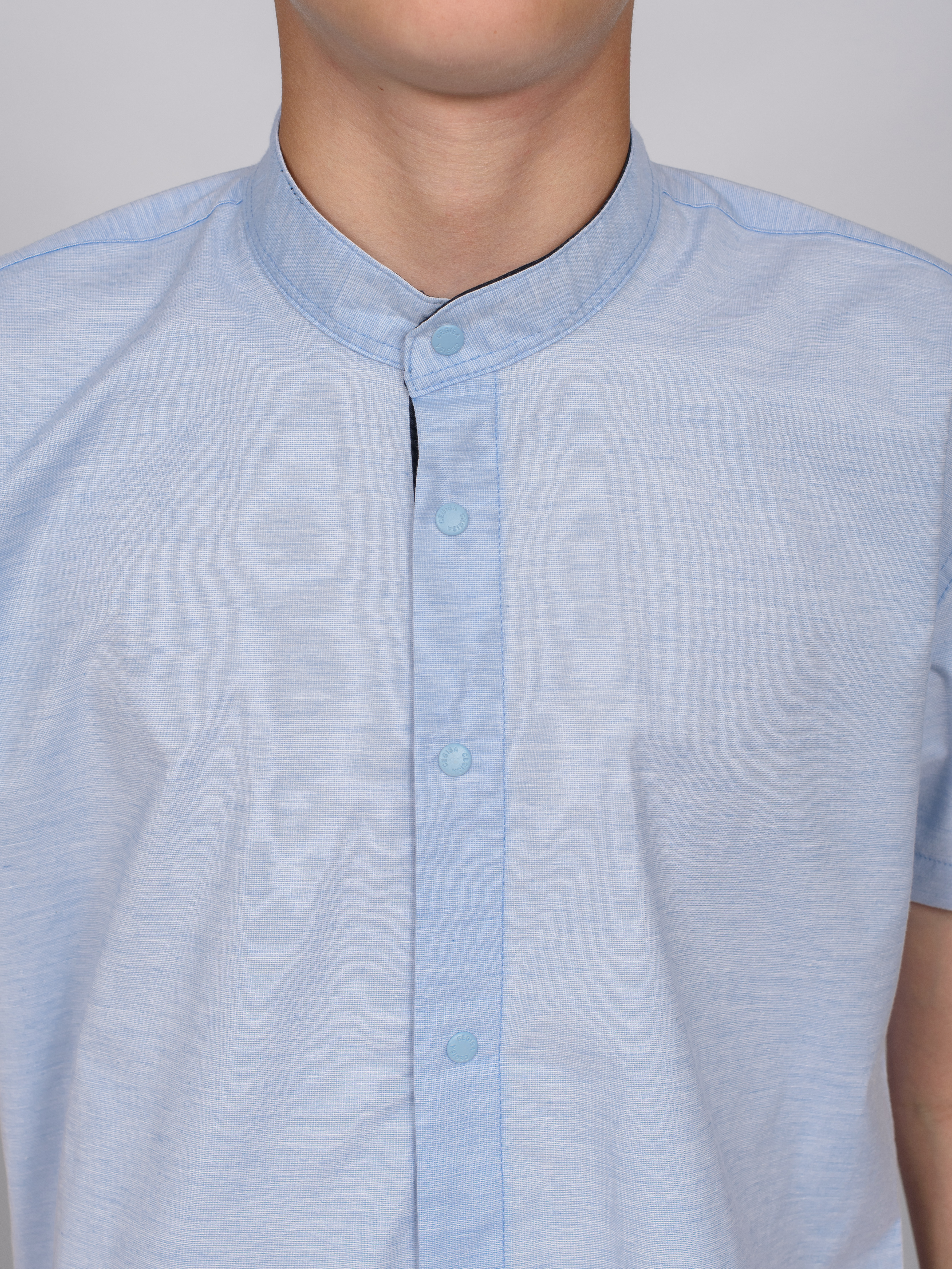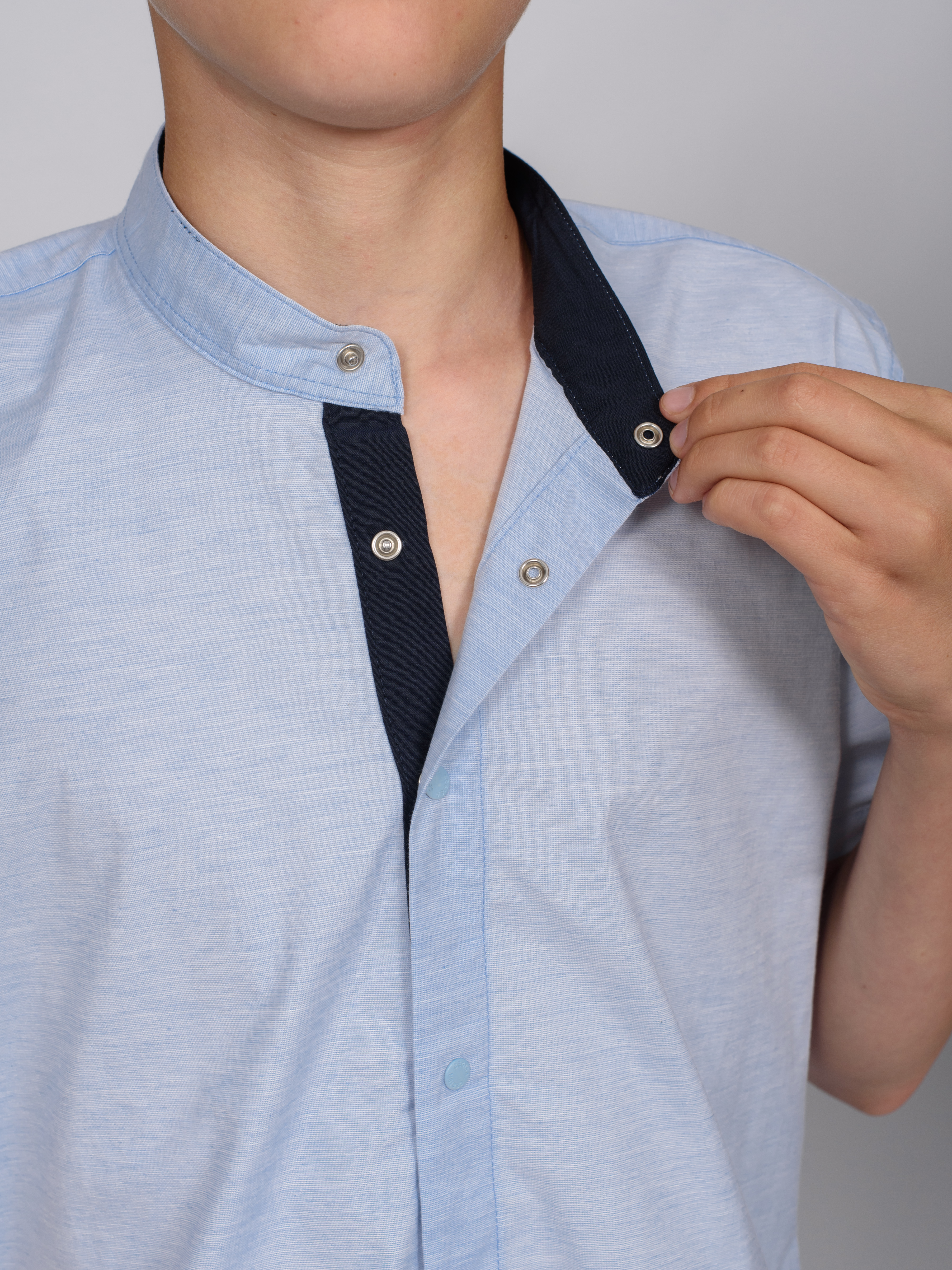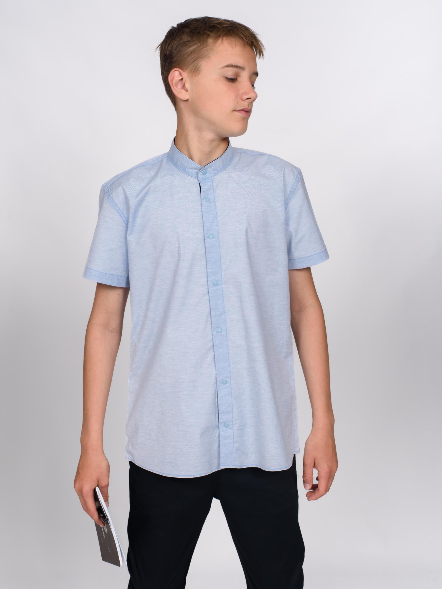 Школьная рубашка Cegisa оптом приталенного кроя с короткими рукавами, воротничком-стойка, застегивается на кнопки. Воротничок и планка с внутренней стороны отделаны однотонной тканью темно-синего цвета.
