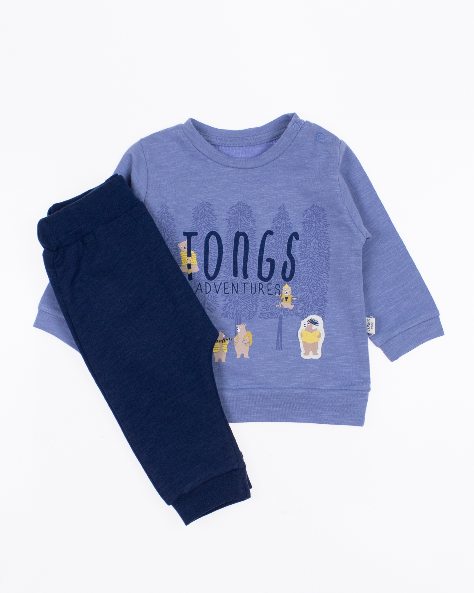Детский комплект TONGS BABY оптом состоит из свитшота и джогерров. На свитшоте и штанишках присутствуют манжеты, которые можно подвернуть . Ткань мягкая, дышащая, 100% хлопок. Можно носить дома, на прогулку и в гости.