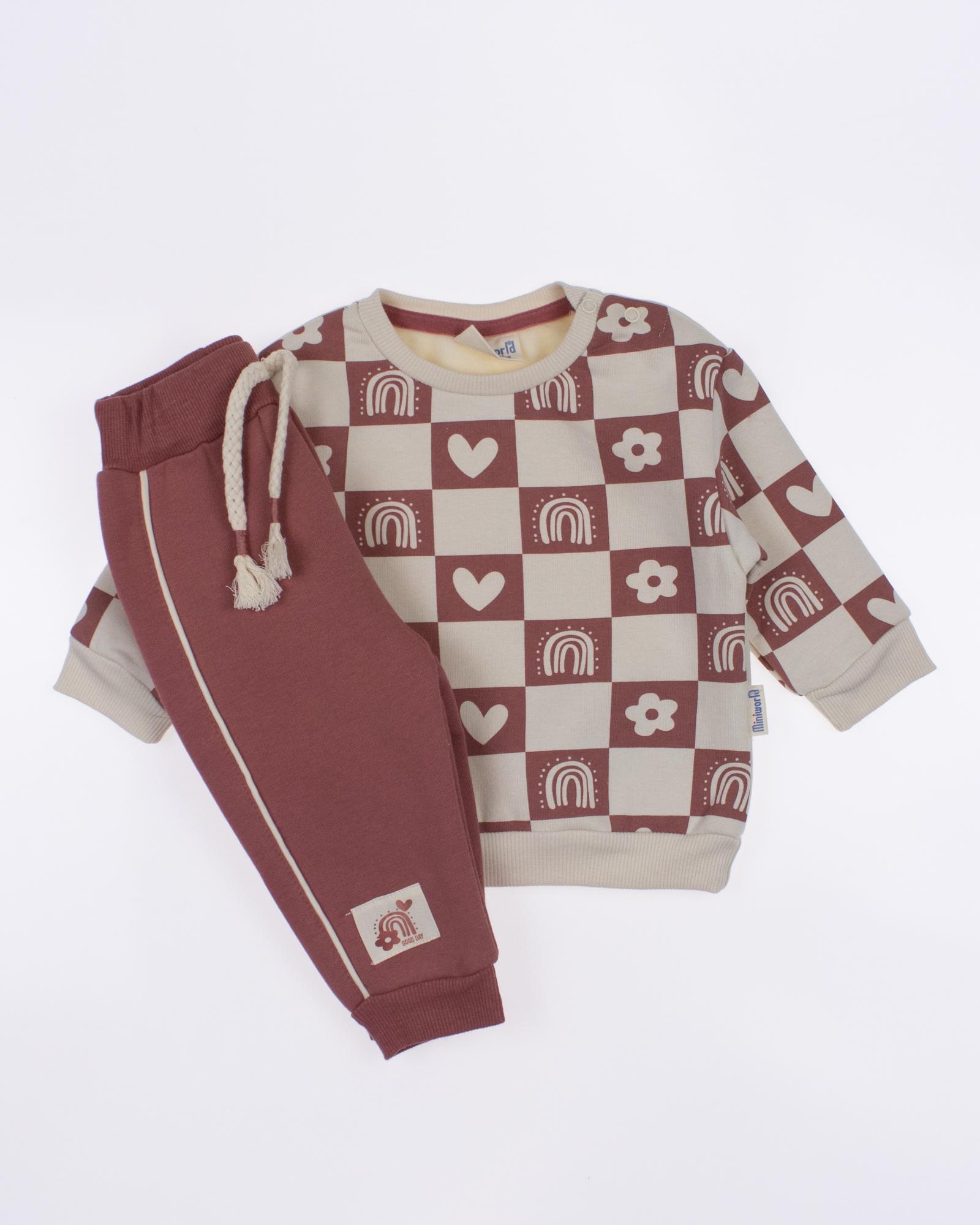 Мы предлагаем оптовые продажи детской одежды производства Турция. Хлопковый костюм  MINIWORLD выполнен из  хлопка с начесом , что гарантирует комфорт и безопасность для самых маленьких детей. Свитшот имеет удобную застежку-кнопки на плече, что облегчит процесс надевания и снятия одежды. Штанишки с мягкими манжетами на эластичном поясе идеально подходят для ношения с подгузником, обеспечивая свободу движений и комфорт. Детский милый принт на костюме поможет развить фантазию и воображение ребенка, делая его образ ярким и запоминающимся. Костюм MINIWORLD - отличный выбор для маленьких модников и их заботливых родителей. Не упустите возможность приобрести этот уникальный товар оптом по выгодной цене!